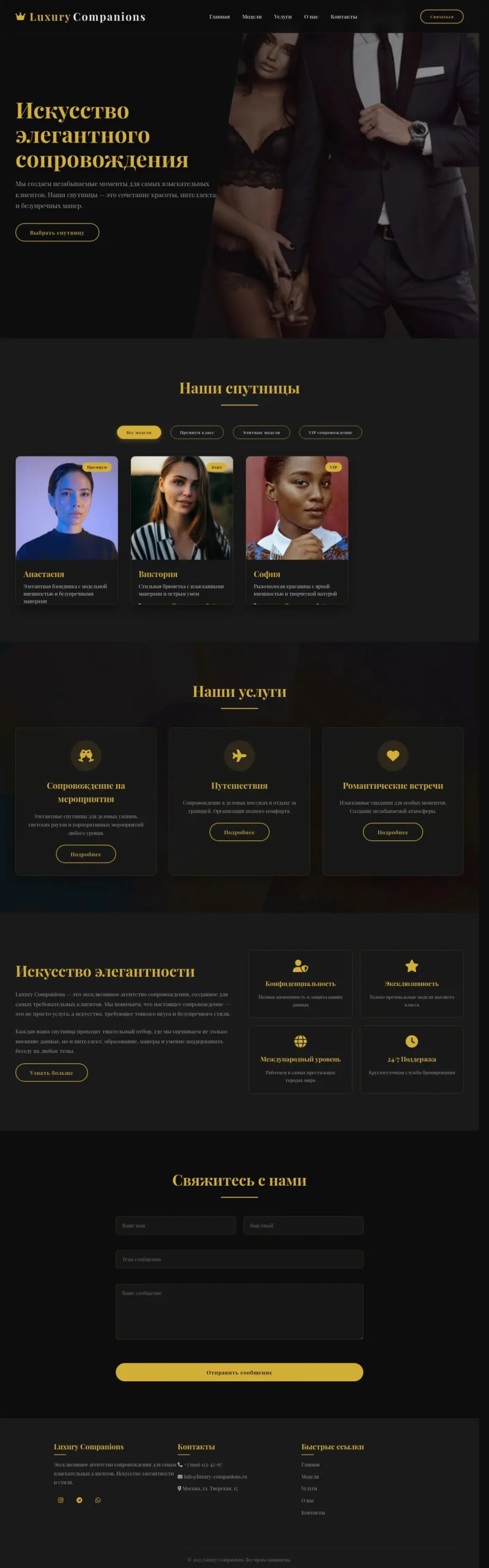 Это полнофункциональный HTML-шаблон, созданный для Эскорт услуги. Он сочетает в себе современный дизайн и чистый код, что делает его идеальным выбором для вашего следующего проекта. Шаблон полностью адаптивен и отлично выглядит на всех устройствах, от мобильных телефонов до настольных компьютеров. В комплект входят все необходимые страницы и компоненты для быстрого запуска вашего сайта.